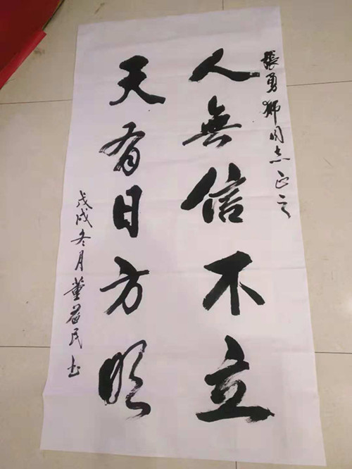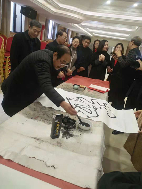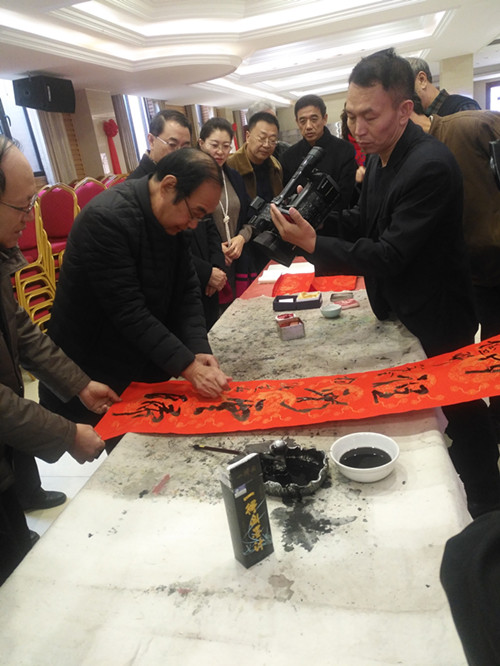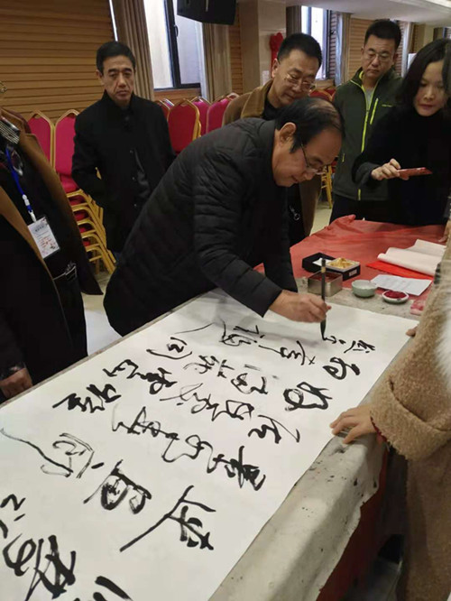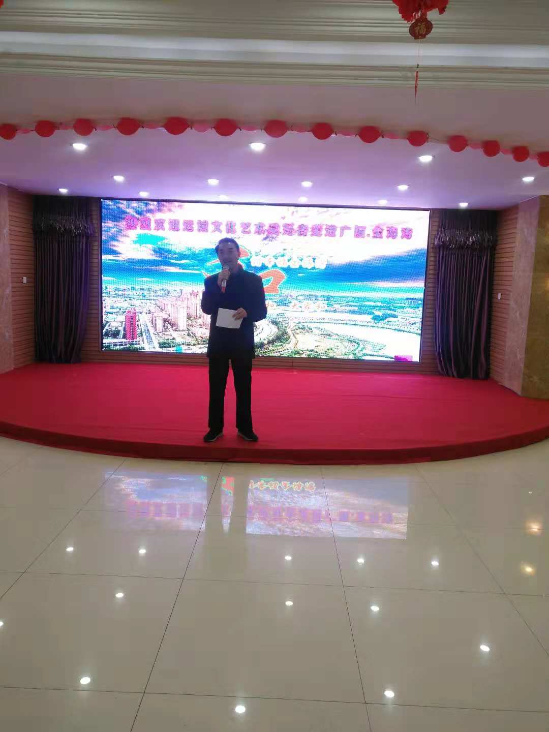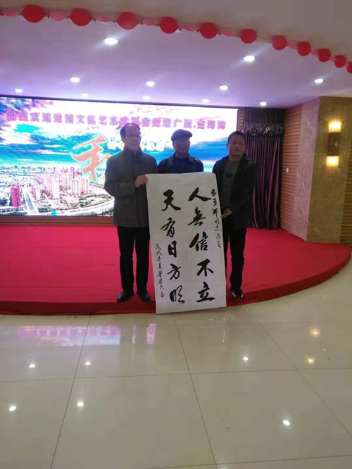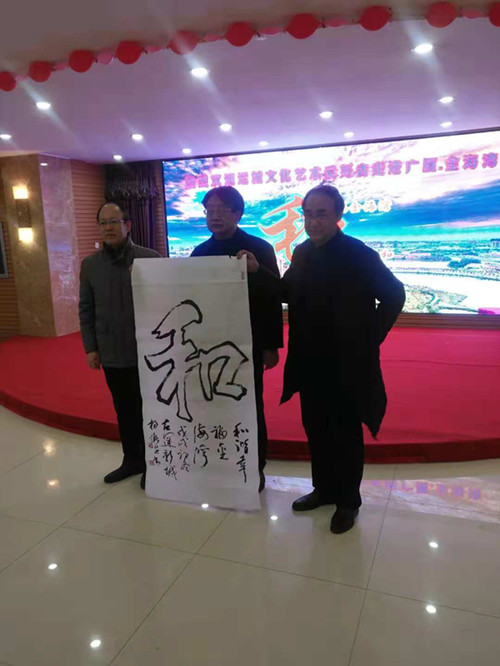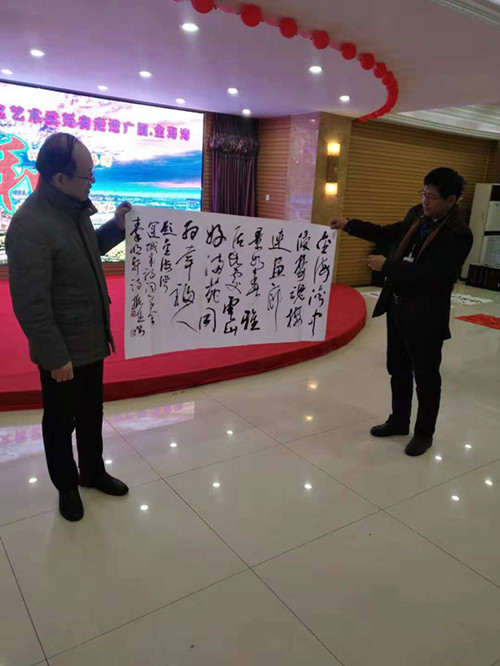 中國(guó)書(shū)法家協(xié)會(huì)會(huì)員、山西省運(yùn)城市楹聯(lián)學(xué)會(huì)會(huì)長(zhǎng)楊振生先生揮毫潑墨,寄予金海灣:金海灣中金浪起,彩霞?jí)衾锊试茪w。