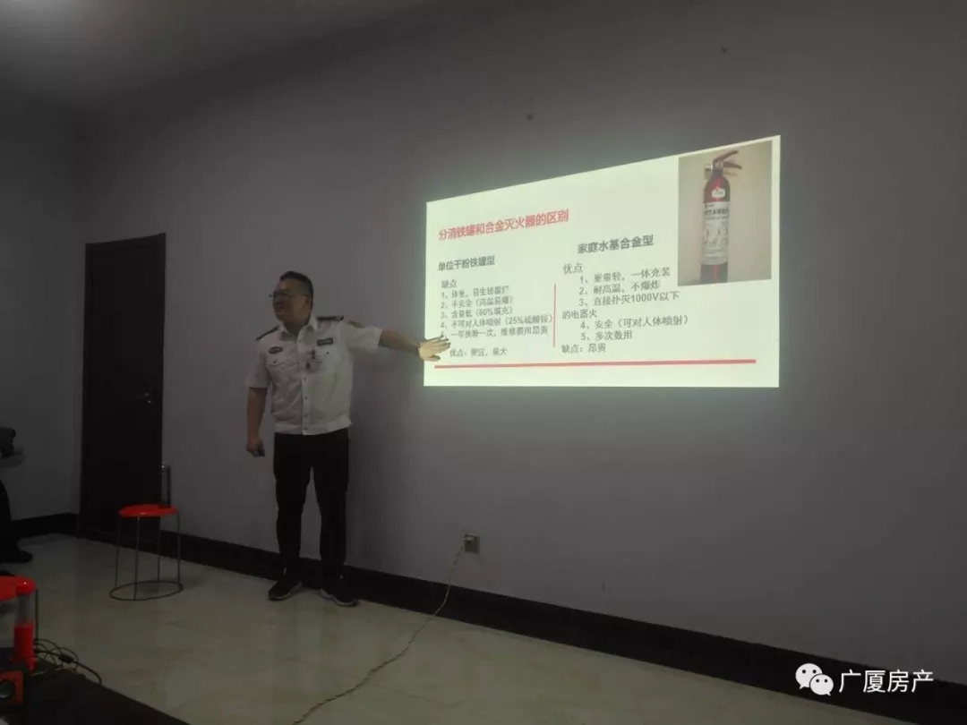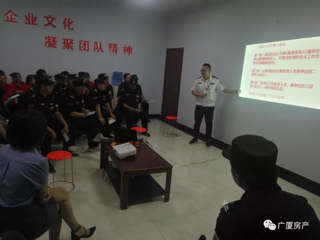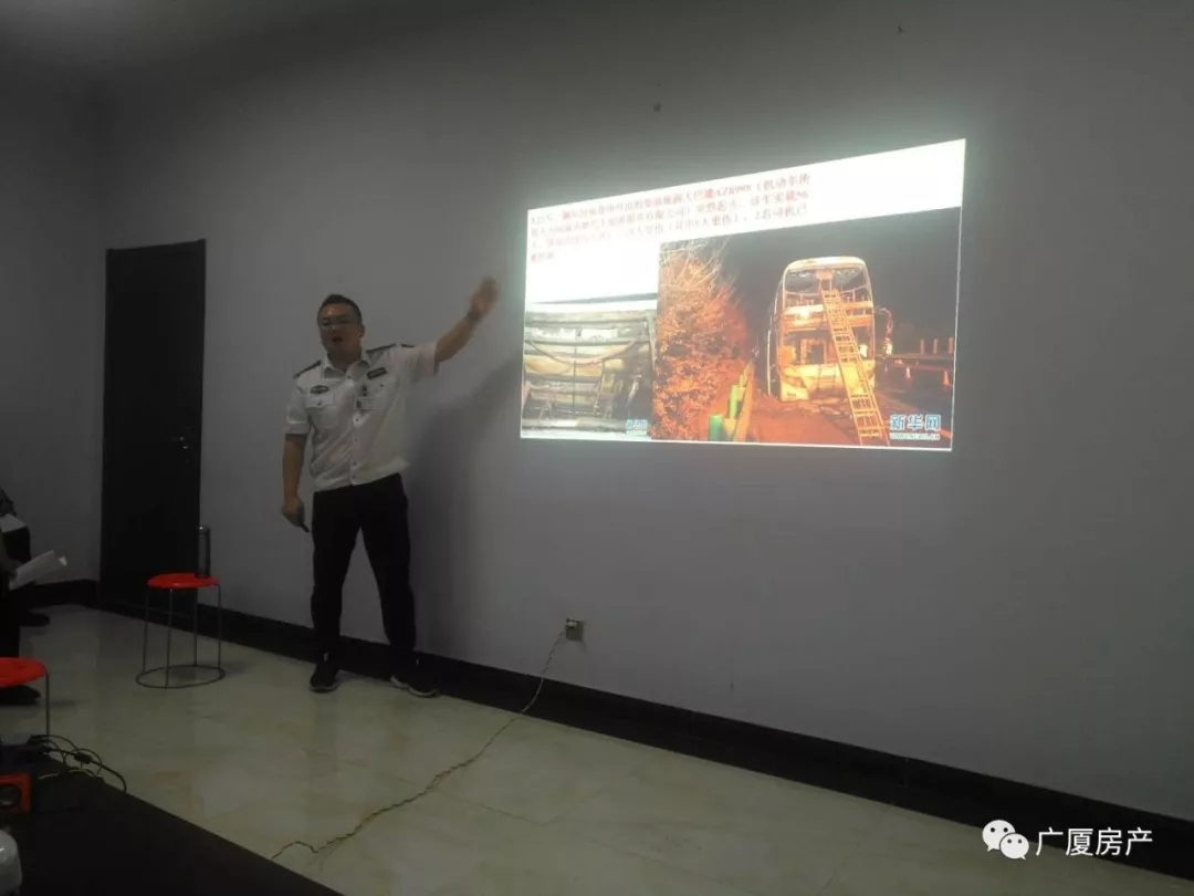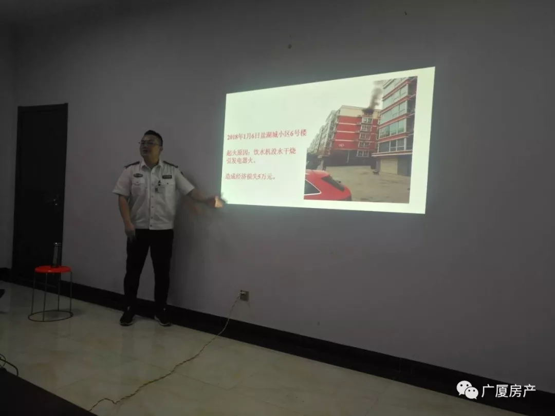 運城民安消防服務(wù)中心李慶亭教官給物業(yè)部門人員講解消防知識,并給大家講了一些自救方法以及生活中我們應(yīng)該注意的一些防火知識