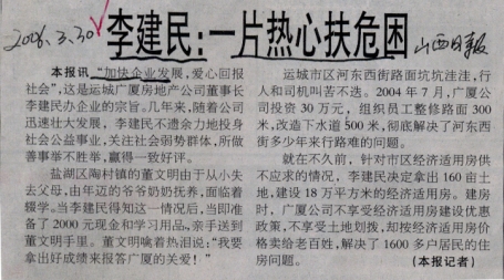 運城市區(qū)和東西街路面坑坑洼洼,行人和司機叫苦不迭。2004年7月,廣廈公司投資30萬元,組織員工整修路面300米,改造下水道500米,徹底解決了河?xùn)|西街多少年來行路難的問題。