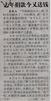 今年17歲的馬戀弟剛出生就被親生父母遺棄。被鹽湖區(qū)龍居鎮(zhèn)趙村一馬姓農(nóng)家收養(yǎng)后,她又遭遇一連串的不幸:先是四五歲時(shí)養(yǎng)母棄她而去,15歲正上初三時(shí),病癱多年的養(yǎng)父又病逝。2005年7月,馬戀弟考入運(yùn)城中學(xué)后,李建民從《運(yùn)城日?qǐng)?bào)·晚報(bào)版》上得知她的情況,立即為她送去4000元,使她順利進(jìn)入運(yùn)中上學(xué)。半年后,擔(dān)心馬戀弟上學(xué)費(fèi)用不夠,李建民又再次送上1000元,使馬戀弟的高中生活沒(méi)有因費(fèi)用問(wèn)題受到影響。